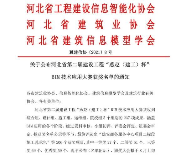 据悉,本次大赛由河北省工程建设信息智能化协会、河北省建筑业协会、河北省建筑信息模型学会共同举办,共收到237项参赛成果,最终评选出一等奖27个,二等奖51个,三等奖69个,优秀奖59个。此次获奖,充分展现了公司BIM技术应用水平和实力,彰显了企业品牌形象。(BIM中心)